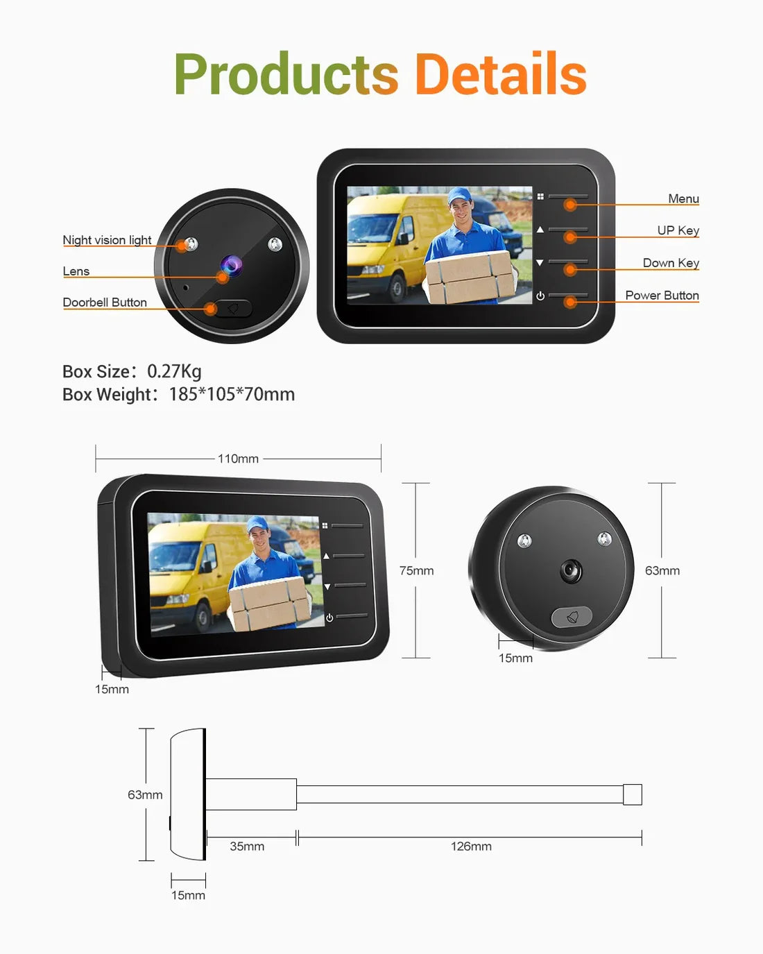 Ova kamera zamenjuje špijunku. Ekran prikazuje jasnu sliku osobe pred vratima. Takođe je moguće sačuvati slike ili video zapis. Instalacija je jednostavna i kamera odgovara standardnoj rupi za špijunku.
